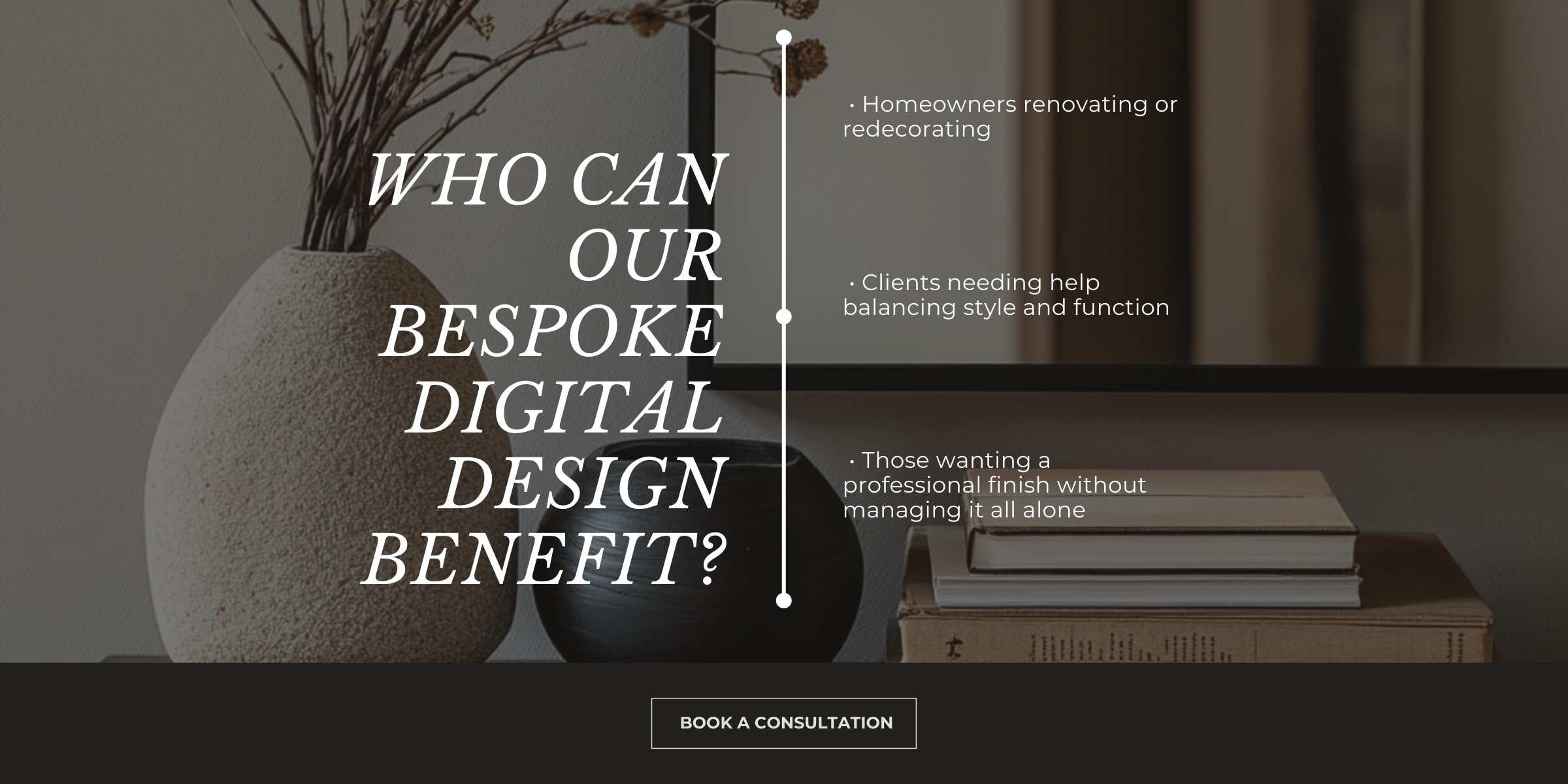 We start with a discovery session (in person or virtual) to understand your lifestyle, tastes, needs, and budget.
